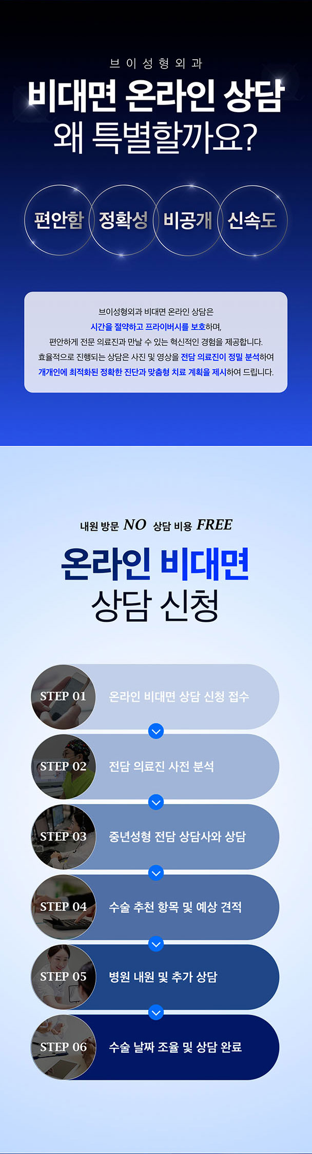 정확한 상담을 위해 정면, 45도, 90도 측면 사진 및 현재 고민 부위를 명확히 보여주는 영상을 첨부해 주세요