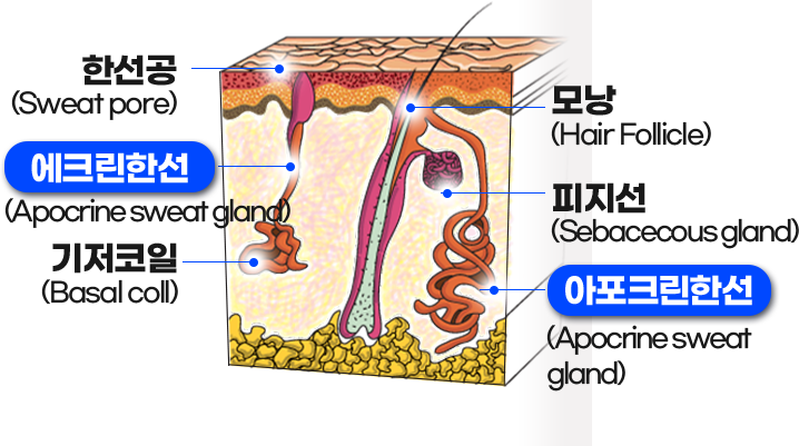 다른 하나는 주로 냄새를 내는 아포크린한선이라고 불리는 땀샘입니다.